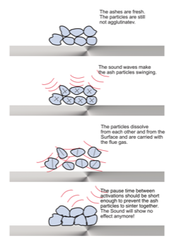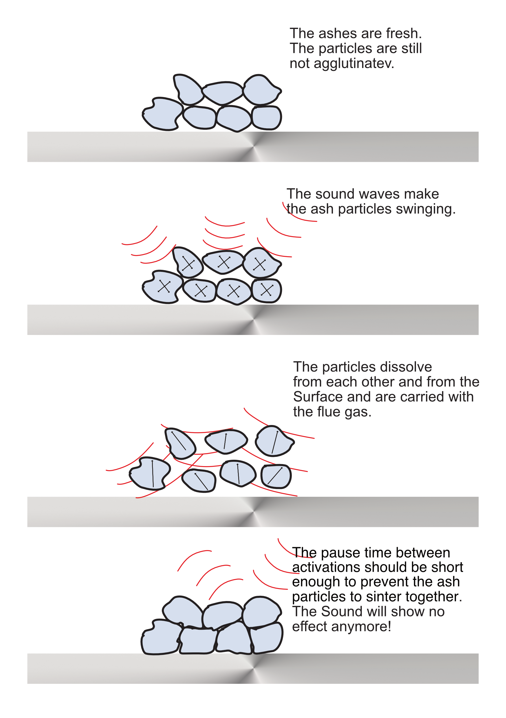 Les ondes sonores des émetteurs provoquent une vibration ou un mouvement continuel des particules. Principalement, ce procédé technique peut mettre en mouvement tous types de poussières, cendres et poudres – dépendant fortement de l‘humidité des composants – jusqu‘à un maximum de granulométrie. Cela empèche le dépôt de cettes particules fines sur les surfaces. À la différence d‘autres procédés de nettoyage, celui-ci maintient la propreté des surfaces. Du fait de leur propagation sphérique, les ondes sonores peuvent même atteindre par réflexion l‘arrière des structures complexes.